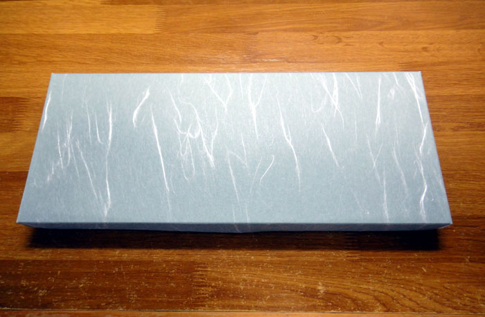 とても丁寧な梱包で届きました(感謝!)。エアパッキン(プチプチ)を外すと、和紙風の高級感のある上品な箱に扇子と扇子袋が入っていました。