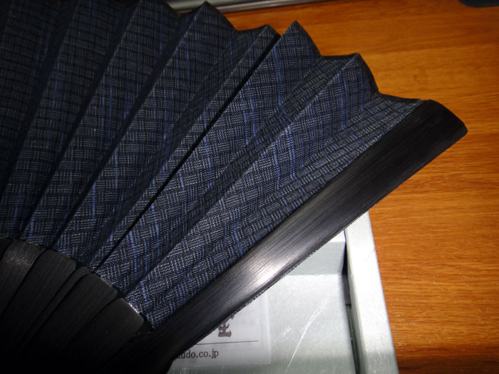 写真で見ていたとおり、扇骨はがっちりとしていてボリューム感があって骨太。また扇面の生地も触ってみると、肉厚でとても丈夫そうです。扇子を開閉した感触は新品ということもあるかもしれませんが、スムーズでありながら、扇面の生地がシッカリとした感じが手に伝わります。なかなかいい感じです。。